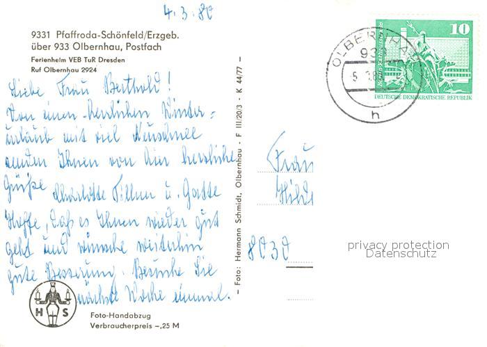 72986397 alte Postkarte Schoenfeld Pfaffroda Ferienheim VEB TuR Dresden im Winter postalisch gelaufen Erhaltung siehe scans [FriedD77] KatCode: 11110014181285