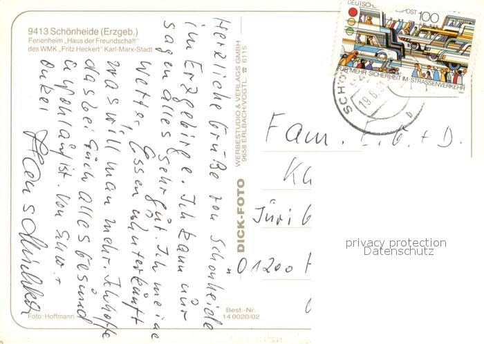 73660418 alte Postkarte Schoenheide Erzgebirge Ferienheim Haus der Freundschaft des WMK Fritz Heckert Karl Marx Stadt postalisch gelaufen Erhaltung siehe scans [FriedD77] KatCode: 11110014191290