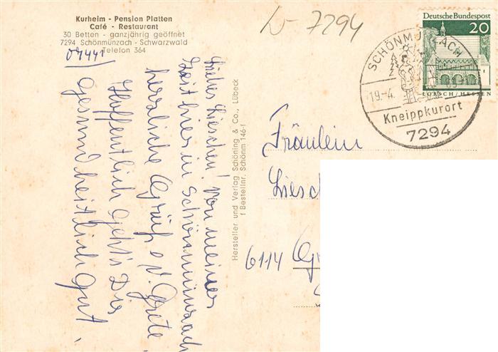73888341 alte Postkarte Schoenmuenzach Baiersbronn Kurheim Pension Platten postalisch gelaufen Erhaltung siehe scans [WerneD78] KatCode: 11110008237004