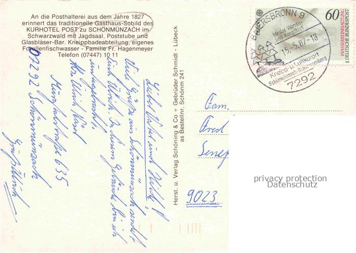 74095610 alte Postkarte Schoenmuenzach Baiersbronn Kurhotel Post postalisch gelaufen Erhaltung siehe scans [WerneD78] KatCode: 11110008237004