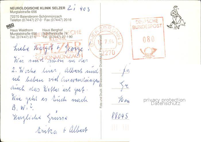 72567058 alte Postkarte Schoenmuenzach Baiersbronn Meurologische Klinik Selzer postalisch gelaufen Erhaltung siehe scans [LiesaD40] KatCode: 11110008237004