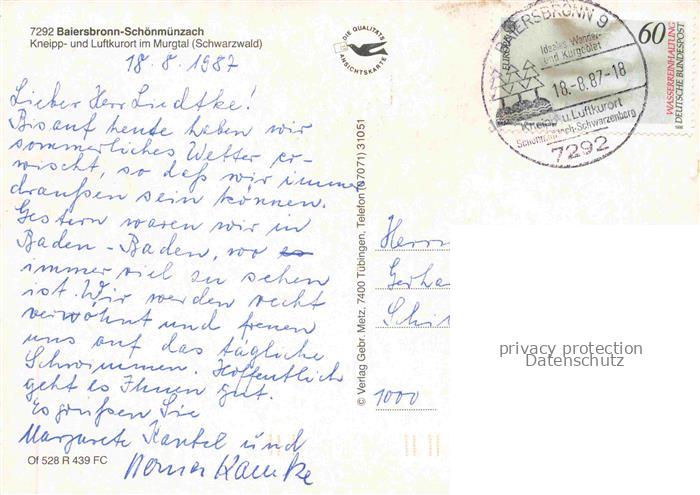74025442 alte Postkarte Schoenmuenzach Baiersbronn Panorama Kneipp- und Luftkurort im Murgtal postalisch gelaufen Fliegeraufnahme Erhaltung siehe scans [FriedD77] KatCode: 11110008237004