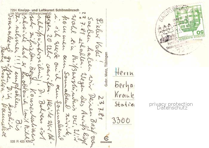 72889359 alte Postkarte Schoenmuenzach im Murgtal postalisch gelaufen Erhaltung siehe scans [WerneD78] KatCode: 11110008237004