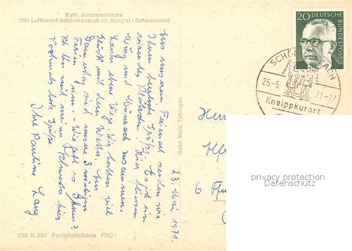 73217088 alte Postkarte Schoenmuenzach Katholische Johanneskirche postalisch gelaufen Erhaltung siehe scans [KathaD81] KatCode: 11110008237004