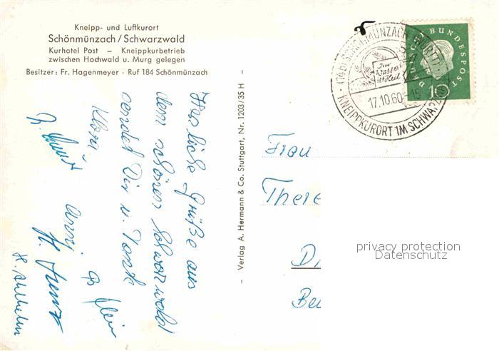 72797723 alte Postkarte Schoenmuenzach Kurhotel Post postalisch gelaufen Erhaltung siehe scans [FriedD77] KatCode: 11110008237004