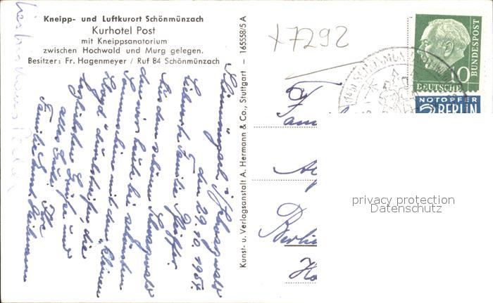 41800905 alte Postkarte Schoenmuenzach Kurhotel Post postalisch gelaufen Erhaltung siehe scans KatCode: 11110008237004