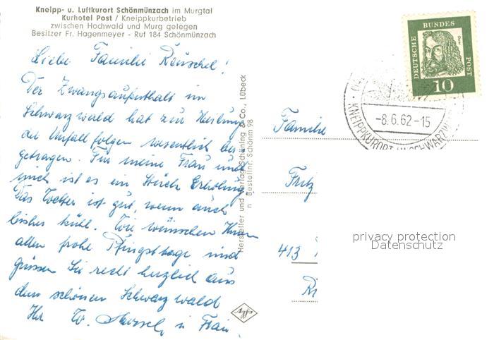 73645587 alte Postkarte Schoenmuenzach Kurhotel Post postalisch gelaufen Erhaltung siehe scans [WerneD78] KatCode: 11110008237004
