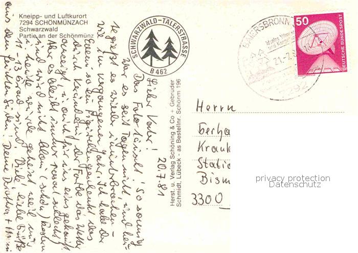 72889360 alte Postkarte Schoenmuenzach Partie an der Schoenmuenzach postalisch gelaufen Erhaltung siehe scans [WerneD78] KatCode: 11110008237004