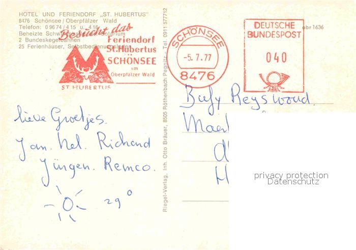 72655131 alte Postkarte Schoensee Hotel Feriendorf St. Hubertus postalisch gelaufen Erhaltung siehe scans [LiesaD40] KatCode: 11110009376160