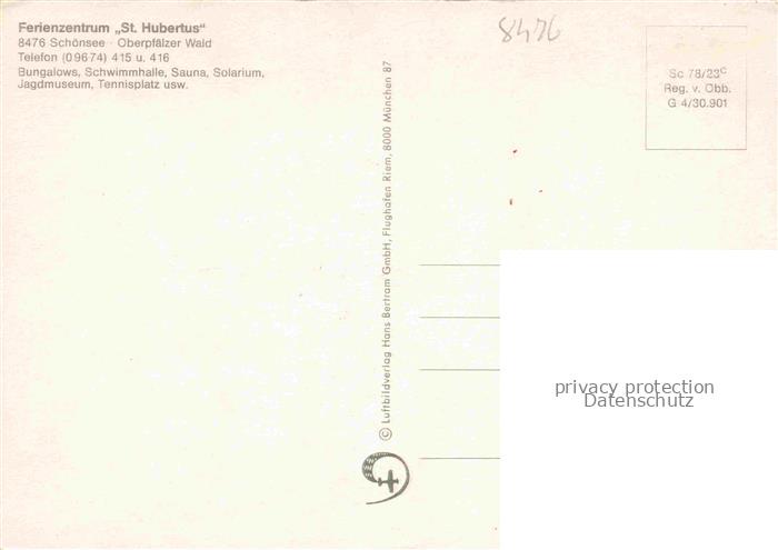 74049472 Schoensee Oberpfalz Ferienzentrum St. Hubertus Oberpfaelzer Wald postalisch nicht gelaufen Fliegeraufnahme Erhaltung siehe scans [FriedD77] KatCode: 11110009376160