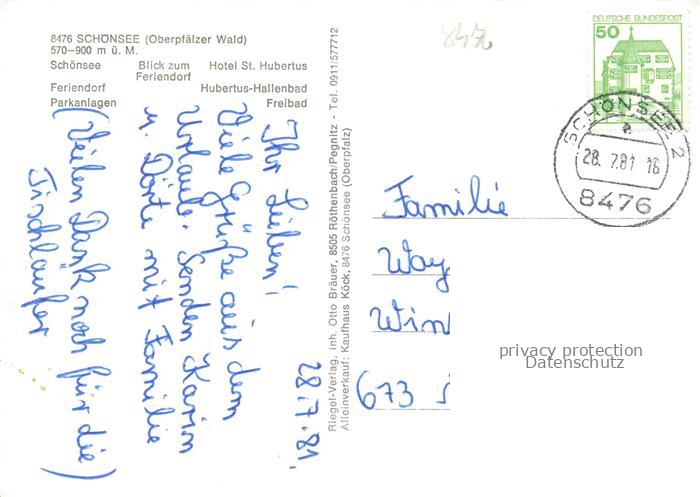 74049478 alte Postkarte Schoensee Oberpfalz Panorama Feriendorf Hotel St. Hubertus Park Hallenbad Freibad postalisch gelaufen Erhaltung siehe scans [FriedD77] KatCode: 11110009376160