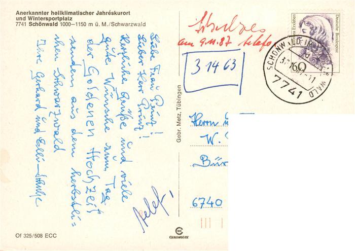 73926900 alte Postkarte Schoenwald Schwarzwald Brendturm Panorama Stoecklewaldturm Blindensee Triberger Wasserfall postalisch gelaufen Erhaltung siehe scans [FriedD77] KatCode: 11110008326054