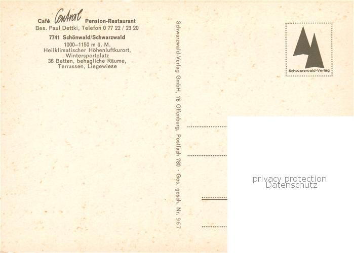 73844707 Schoenwald Schwarzwald Cafe Central Pension Restaurant postalisch nicht gelaufen Erhaltung siehe scans [WerneD78] KatCode: 11110008326054