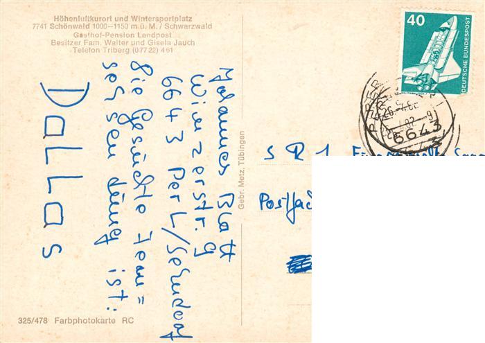 73872390 alte Postkarte Schoenwald Schwarzwald Gasthof Landpost postalisch gelaufen Erhaltung siehe scans [WerneD78] KatCode: 11110008326054