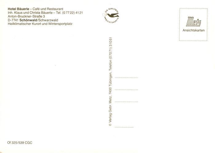 73926905 Schoenwald Schwarzwald Hotel Baeuerle Cafe Restaurant postalisch nicht gelaufen Erhaltung siehe scans [FriedD77] KatCode: 11110008326054