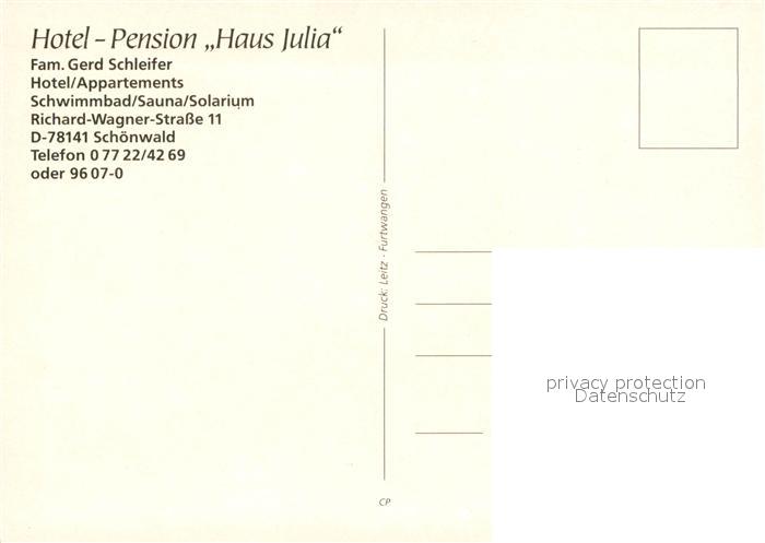 73543003 Schoenwald Schwarzwald Hotel Pension Haus Julia postalisch nicht gelaufen Erhaltung siehe scans [FriedD77] KatCode: 11110008326054