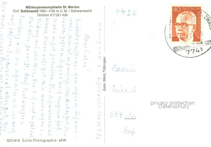73687545 alte Postkarte Schoenwald Schwarzwald Muettergenesungsheim St Marien postalisch gelaufen Erhaltung siehe scans [WerneD78] KatCode: 11110008326054