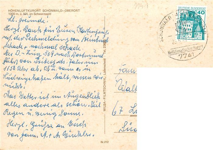 73926913 alte Postkarte Schoenwald Schwarzwald Oberort Fliegeraufnahme postalisch gelaufen Erhaltung siehe scans [FriedD77] KatCode: 11110008326054