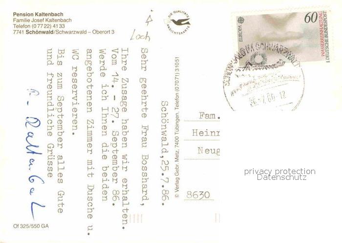 72861769 alte Postkarte Schoenwald Schwarzwald Pension Kaltenbach postalisch gelaufen Erhaltung siehe scans [FriedD77] KatCode: 11110008326054