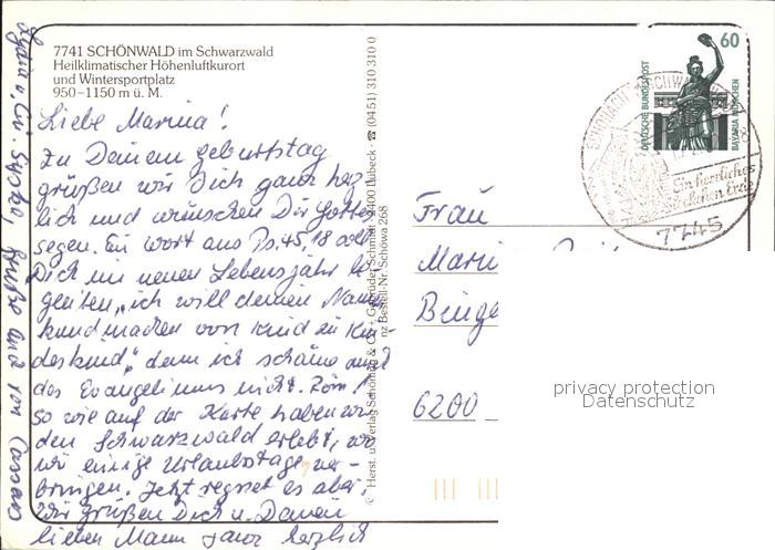 72563299 alte Postkarte Schoenwald Schwarzwald Ski postalisch gelaufen Erhaltung siehe scans [AndreD76] KatCode: 11110008326054