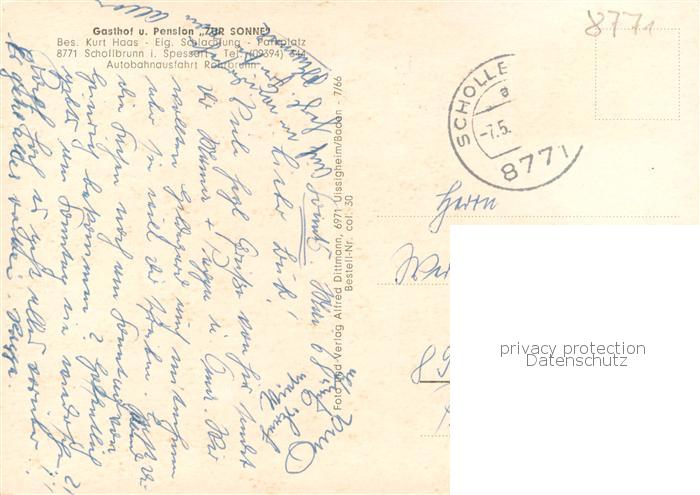 73760272 alte Postkarte Schollbrunn Spessart Gasthof-Pension Zur Sonne Teilansichten postalisch gelaufen Erhaltung siehe scans [LiesaD40] KatCode: 11110009677182