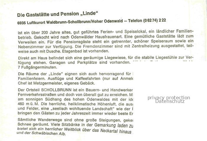 74047607 Schollbrunn Waldbrunn Neckar-Odenwald BW Gaststaette Pension Linde Gaststube Wassertretanlage Panorama postalisch nicht gelaufen Werbekarte (keine Postkarte) Erhaltung siehe scans [WerneD78] KatCode: 11110008225118