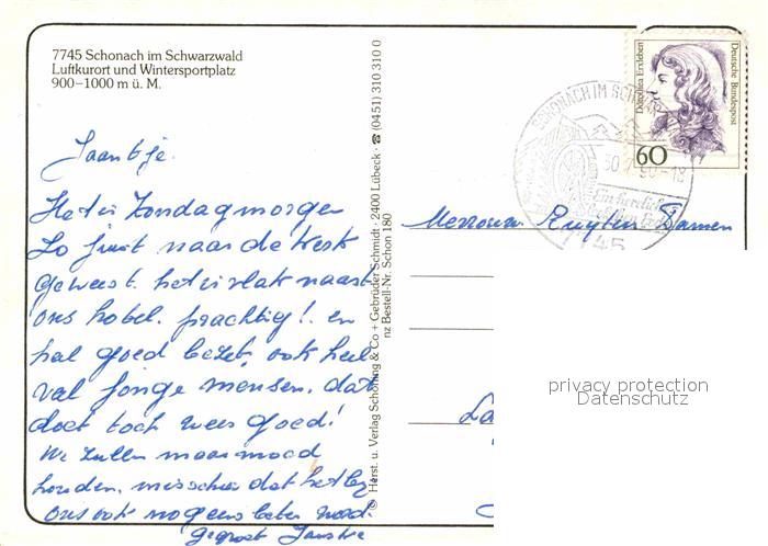 72865084 alte Postkarte Schonach Schwarzwald postalisch gelaufen Erhaltung siehe scans [LiesaD40] KatCode: 11110008326055
