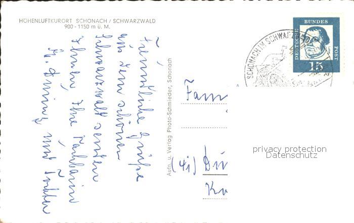 72203620 alte Postkarte Schonach Schwarzwald postalisch gelaufen Erhaltung siehe scans KatCode: 11110008326055