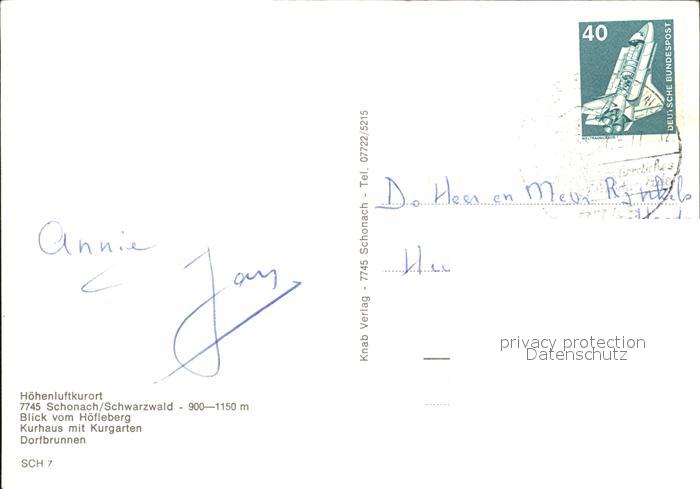72505335 alte Postkarte Schonach Schwarzwald Blick vom Hoefleberg Kurhaus Kurgarten Dorfbrunnen postalisch gelaufen Erhaltung siehe scans KatCode: 11110008326055