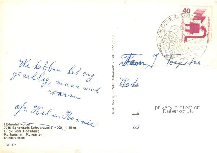73306234 alte Postkarte Schonach Schwarzwald Blick vom Hoefleberg Kurhaus mit Kurgarten Dorfbrunnen postalisch gelaufen Erhaltung siehe scans [WerneD78] KatCode: 11110008326055