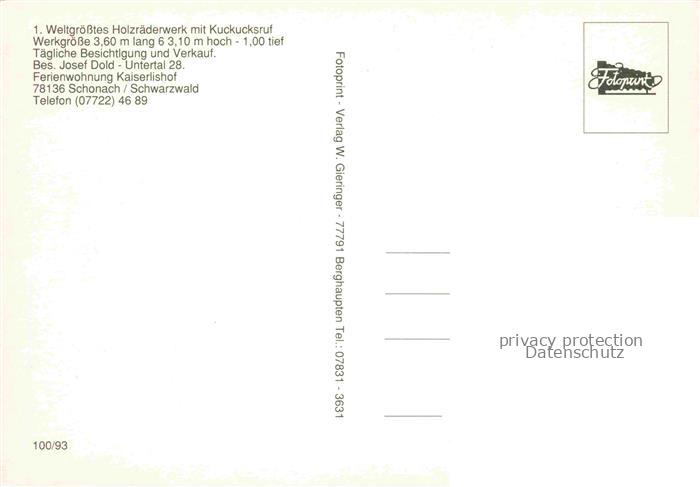 74040352 Schonach Schwarzwald BW 1. Weltgroesstes Holzraederwerk mit Kuckucksuhr Kaiserlishof Ferienwohnungen postalisch nicht gelaufen Erhaltung siehe scans [FriedD77] KatCode: 11110008326055