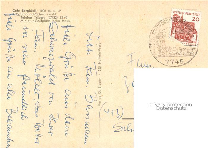 73170752 alte Postkarte Schonach Schwarzwald Cafe Berghuesli postalisch gelaufen Erhaltung siehe scans [KathaD81] KatCode: 11110008326055