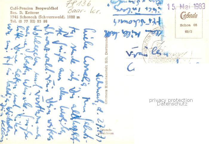73727639 alte Postkarte Schonach Schwarzwald Cafe Pension Bergwaldhof postalisch gelaufen Erhaltung siehe scans [WerneD78] KatCode: 11110008326055