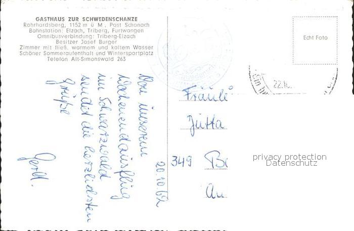 71867448 alte Postkarte Schonach Schwarzwald Gasthaus Zur Schwedenschanze Rohrhardsberg postalisch gelaufen Erhaltung siehe scans KatCode: 11110008326055