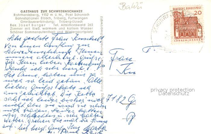 73648514 alte Postkarte Schonach Schwarzwald Gasthaus zur Schwedenschanze postalisch gelaufen Erhaltung siehe scans [FriedD77] KatCode: 11110008326055