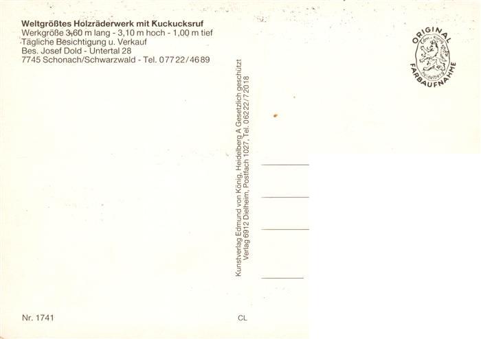 73946654 Schonach Schwarzwald Original Schwarzwaelder Kuckucksuhr Weltgroesstes Holzraederwerk mit Kuckucksruf Trachten postalisch nicht gelaufen Erhaltung siehe scans [FriedD77] KatCode: 11110008326055