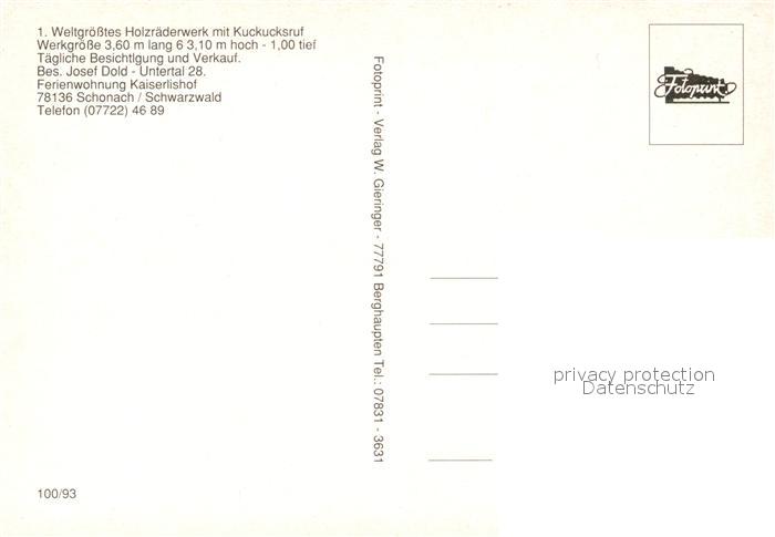73110889 Schonach Schwarzwald Weltgroesste Kuchucksuhr Ferienwohung Kaiserlishof postalisch nicht gelaufen Erhaltung siehe scans [NatalD47] KatCode: 11110008326055