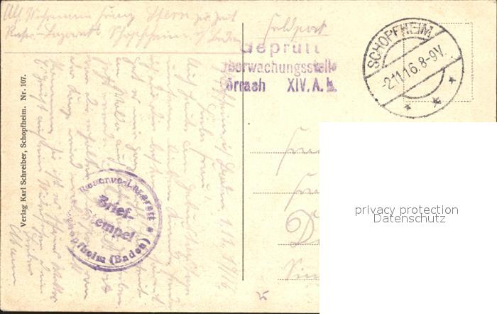 32185992 alte Postkarte Schopfheim Reserve- Lazarett- Zentrale postalisch gelaufen Feldpost Erhaltung siehe scans KatCode: 11110008336081