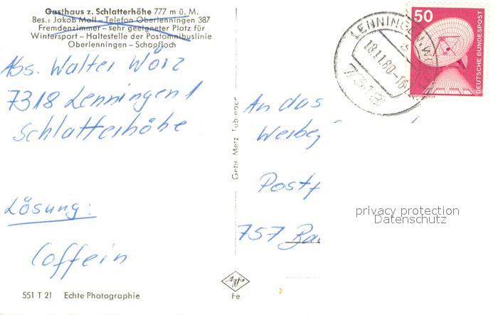 73722630 alte Postkarte Schopfloch Lenningen Gasthaus zur Schlatterhoehe Winterpanorama postalisch gelaufen Erhaltung siehe scans [FriedD77] KatCode: 11110008116079