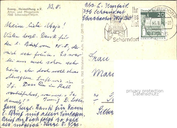 alte Postkarte Schorndorf Wuerttemberg Ev Heimstiftung Altenpflege Heim postalisch gelaufen Erhaltung siehe scans