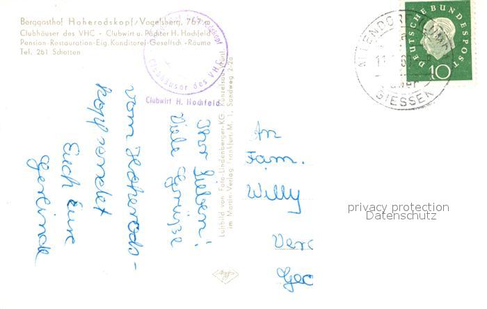 73319601 alte Postkarte Schotten Hessen Berggasthof Hoherodskopf Vogelsberg Fliegeraufnahme postalisch gelaufen Erhaltung siehe scans [FriedD77] KatCode: 11110006535016