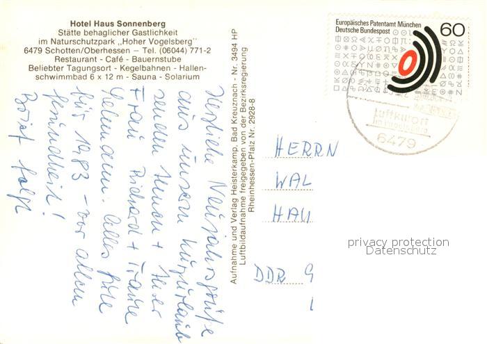 73174772 alte Postkarte Schotten Hessen Fliegeraufnahme Hotel Haus Sonnenberg postalisch gelaufen Erhaltung siehe scans [NatalD47] KatCode: 11110006535016