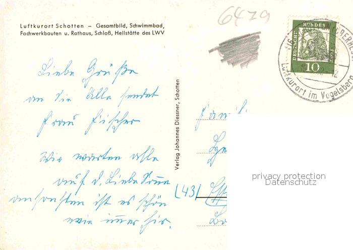 72839464 alte Postkarte Schotten Hessen Panorama Schwimmbad Fachwerkbauten Rathaus Schloss Heilstaette postalisch gelaufen Erhaltung siehe scans [FriedD77] KatCode: 11110006535016
