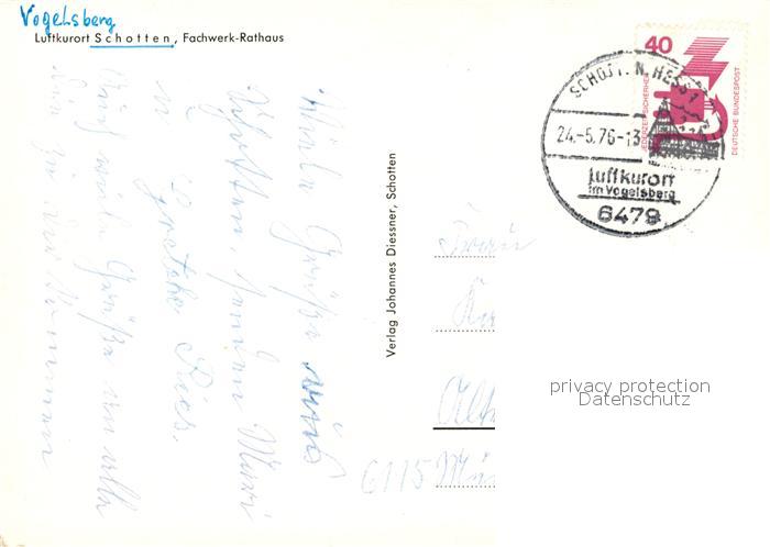 73216760 alte Postkarte Schotten Hessen Rathaus Fachwerkhaus Luftkurort Naturpark Hoher Vogelsberg postalisch gelaufen Erhaltung siehe scans [FriedD77] KatCode: 11110006535016