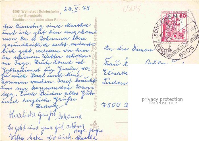 74048838 alte Postkarte Schriesheim Stadtbrunnen beim alten Rathaus postalisch gelaufen Erhaltung siehe scans [WerneD78] KatCode: 11110008226082