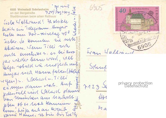 74048852 alte Postkarte Schriesheim Stadtbrunnen mit altem Rathaus postalisch gelaufen Erhaltung siehe scans [WerneD78] KatCode: 11110008226082