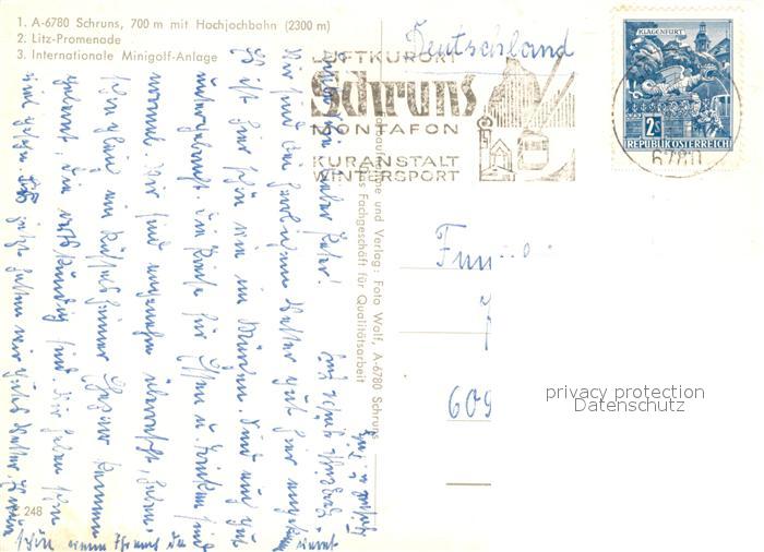 73591843 alte Postkarte Schruns Vorarlberg Gesamtansicht mit Alpenpanorama Hochjochbahn Bergbahn Litz Promenade Minigolfanlage postalisch gelaufen Erhaltung siehe scans [FriedD77] KatCode: 11390341080122