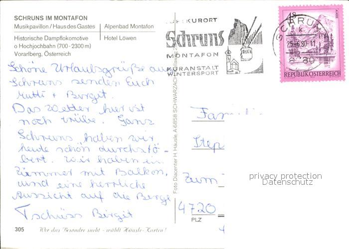 72000835 alte Postkarte Schruns Vorarlberg Musikpavillon Haus Gastes Alpenbad Dampflokomotive Hochjochbahn Hotel Loewen postalisch gelaufen Erhaltung siehe scans KatCode: 11390341080122