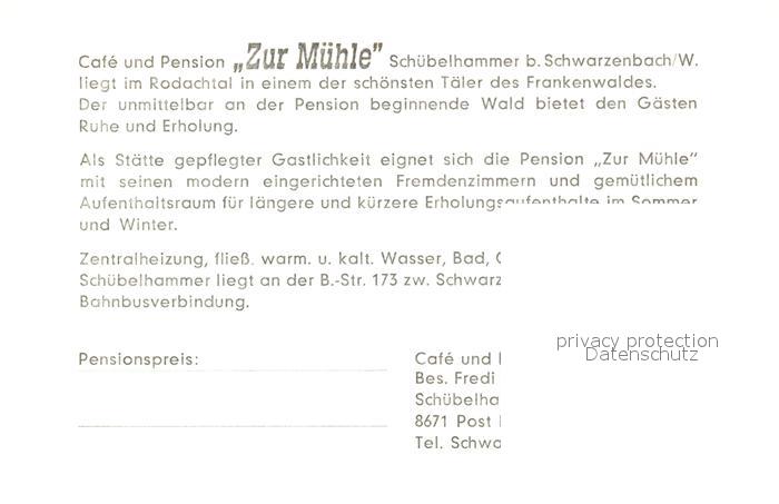 43352254 Schuebelhammer Cafe Pension Zur Muehle Fremdenzimmer Teilansicht Frankenwald postalisch nicht gelaufen Erhaltung siehe scans [WerneD78] KatCode: 11110009475169