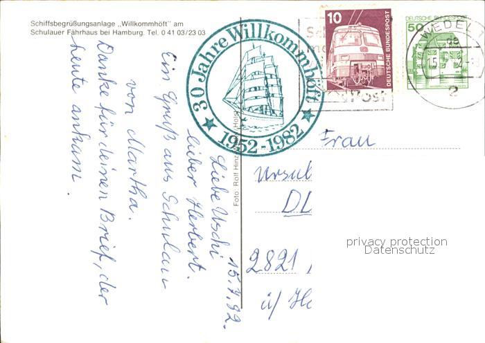 72614667 alte Postkarte Schulau Wedel Schiffsbegruessungsanlage Willkommhoeft am Schulauer Faehrhaus postalisch gelaufen Erhaltung siehe scans [WerneD78] KatCode: 11110001056050